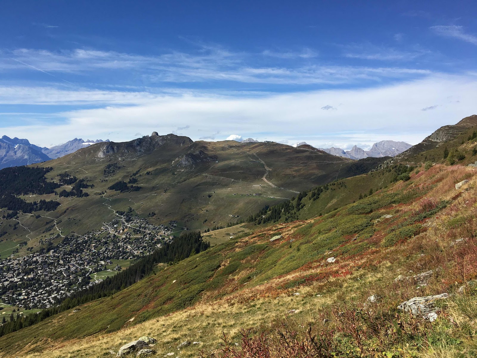 À 13h30, je monte aux Ruinettes à 2200m. Il en coûtera 38CHF pour les deux seules remontées de la journée. Arrivé aux Ruinettes, direction le col Croix de Coeur. Je pensais rouler à Verbier avec les couleurs, mais en fait, les couleurs sont au sol avec les petits arbustes à feuilles. Les feuillus dans la vallée ne sont pas encore en couleurs.